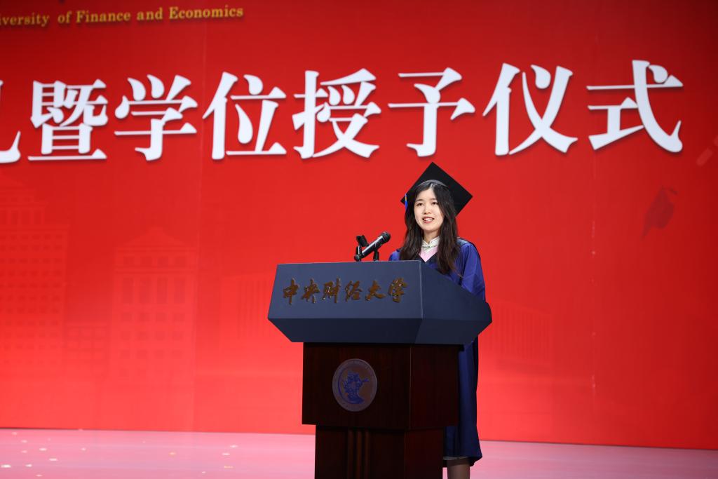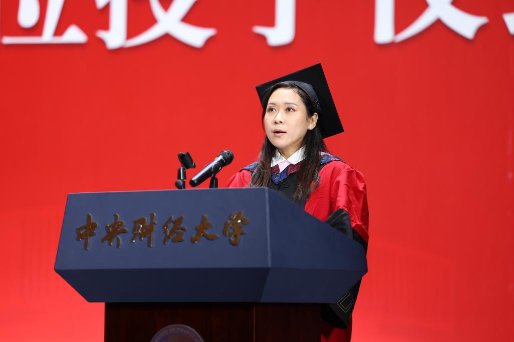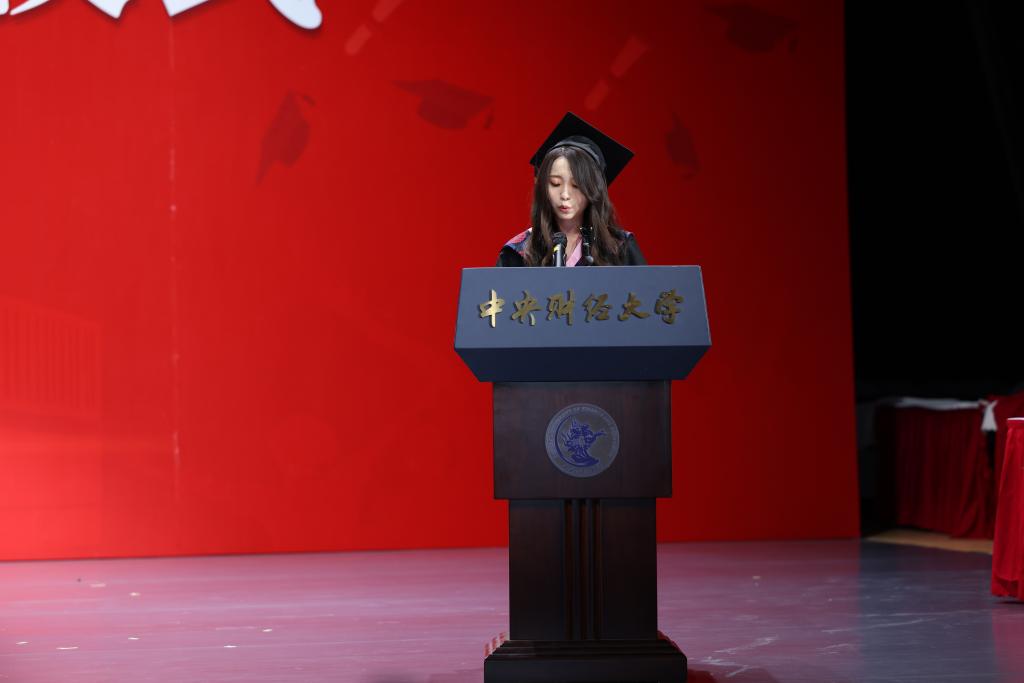 接下来,2023届研究生毕业生代表李周雅雯上台发言。在句句真切的感谢与回忆里,她带领大家回顾了在中财校园里温暖又充实的点滴生活。生逢其时,作为中财大学子,她与大家一起见证并有幸参与建党一百周年、北京冬奥会等多项盛事,以龙马之姿勇立时代浪潮。最后,她真切祝愿:“祝愿学院铸就一流,慕名学子五洲来;祝福老师们工作顺利,执笔教坛驾轻舟;祝愿全体毕业生前程似锦,且以今朝共叙旧。”