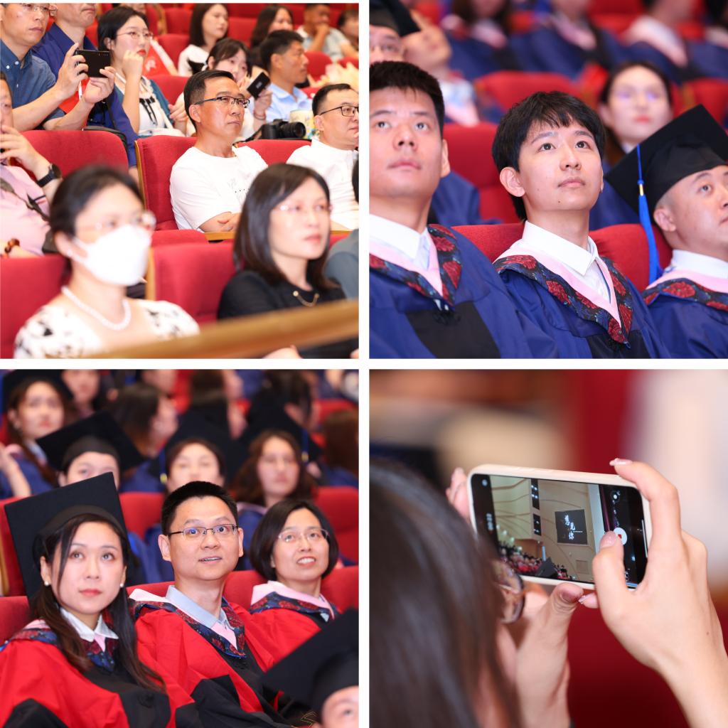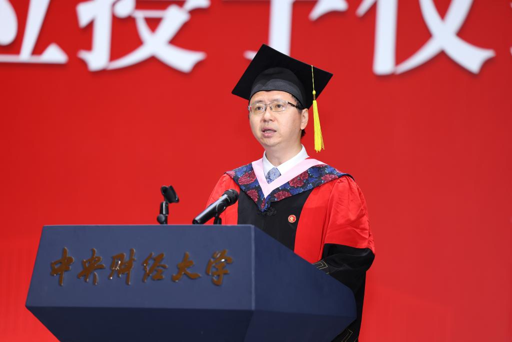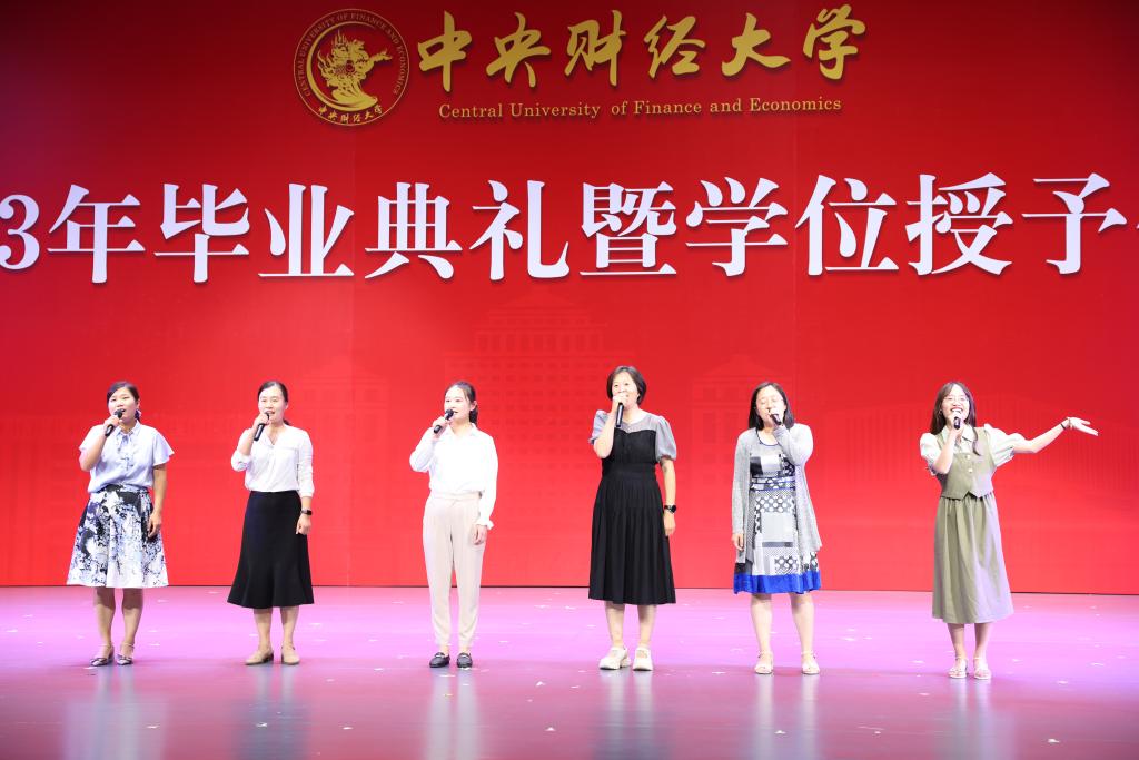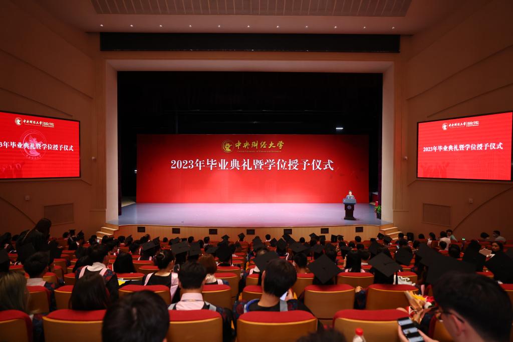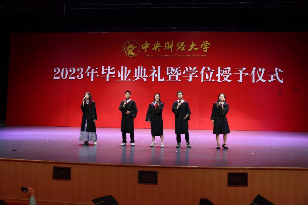 典礼上首先播放了由2022届、2023届毕业生准备的毕业视频。龙马路上的欢声笑语、骋望楼里的废寝忘食、研讨室内的激烈讨论......视频带领大家回忆在中财大的美好时光与点滴记录。此外,学院老师们的谆谆教诲也将时刻提醒同学们不忘专业使命,牢记民生福祉,为国家、为人民做出更大贡献。
