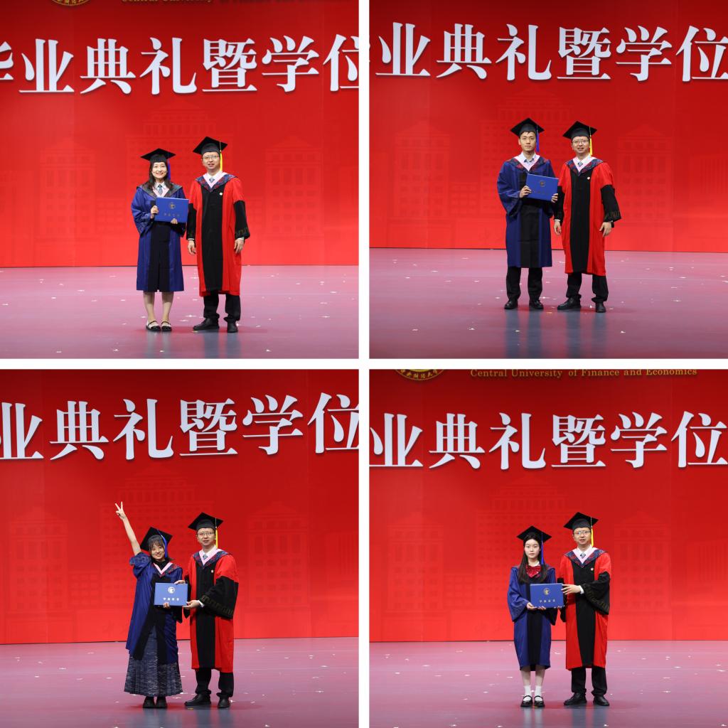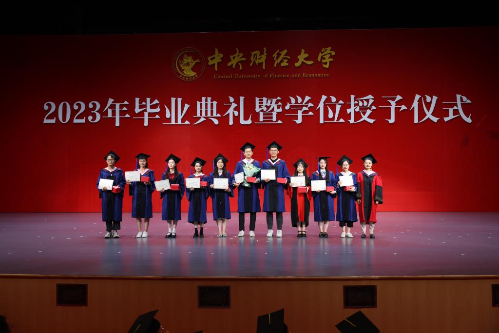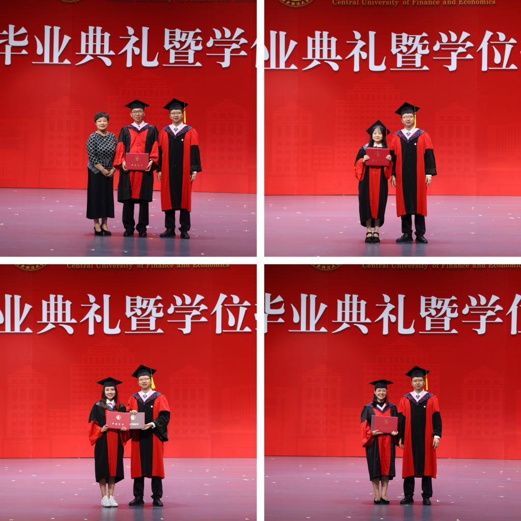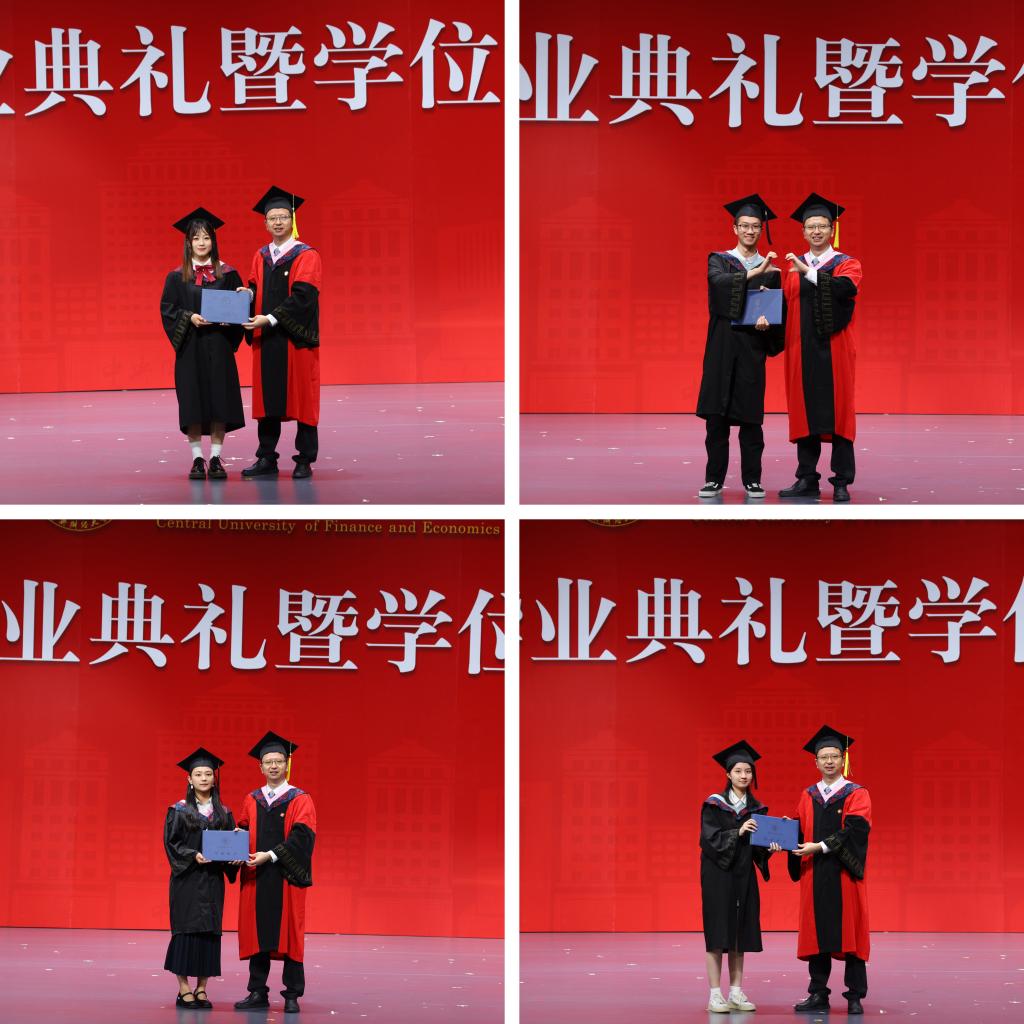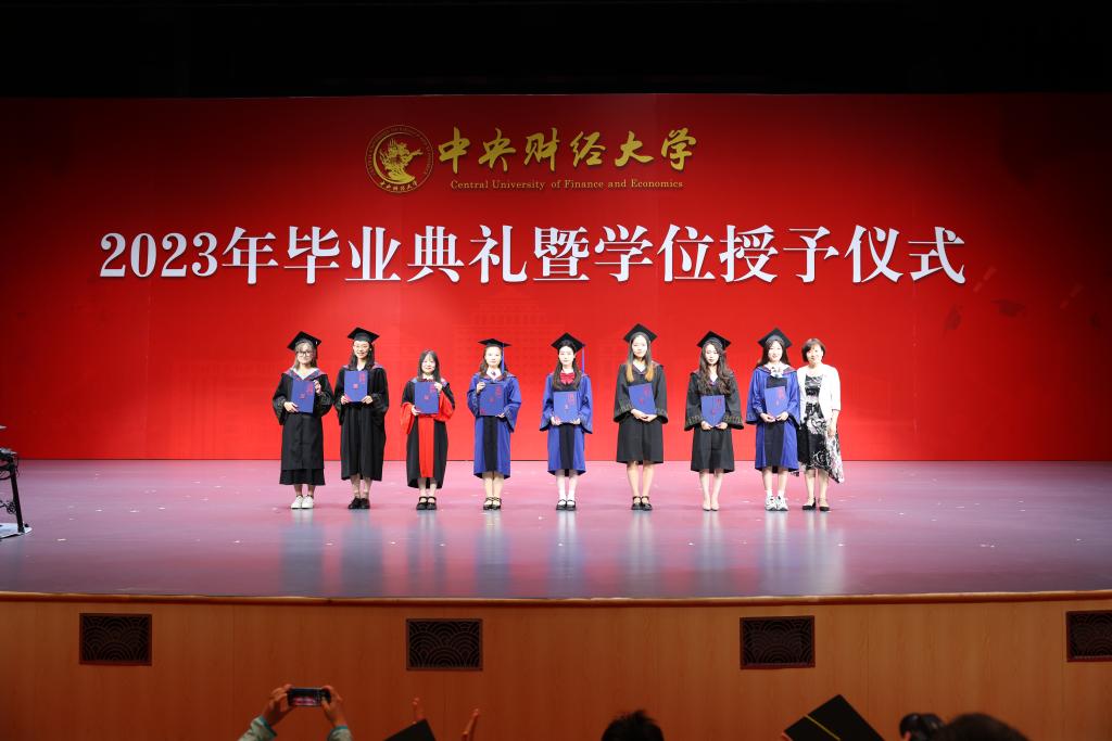 在欢快的音乐声中,学位授予仪式正式开始。由副院长郑苏晋宣读获得博士学位、硕士学位学生名单,副院长王丽珍宣读获得学士学位学生名单,周桦院长分别为两届研究生与本科生进行拨穗正冠、颁发毕业证书并合影留念。望各位同学在未来的人生中担负起对中财精神进行传承和接力的重任,绽放绚丽的青春之花!