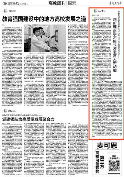 2024年5月13日,《中国教育报》高教周刊以《kaiyun官网中国以“小事小情”传达“微言大义”——创新理论学习模式激发育人新动能》为题,从“翻转互动——学习亦宣讲”“关键时点——传道且授业”“小事小情——微言而大义”“实践致知——知明则行笃”四个维度报道了kaiyun官网kaiyun官网中国党委创新党员理论学习模式的实践与成效。