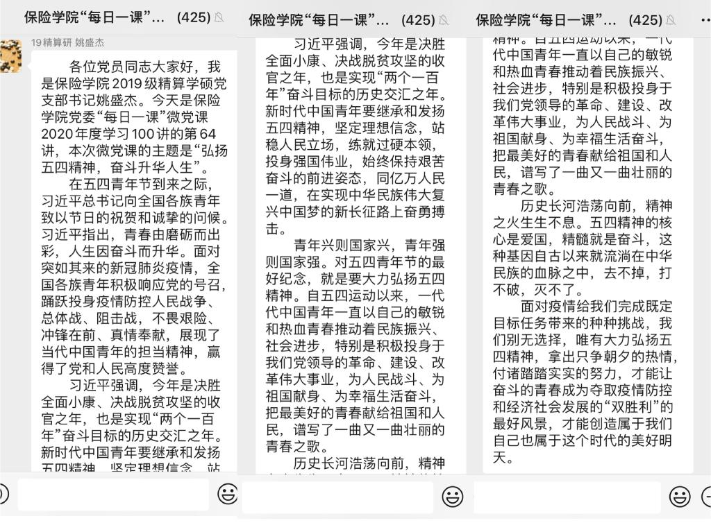 2018级保险专硕党支部孙悦提到,“五四精神”传承至今,在抗疫战争中,90后和95后的担当让全国人民看到新一代青年人的勇敢和坚强。诚然,我们在更优越的生活环境中成长,但并不是经不起风雨的温室花朵,相反,我们更应坚定理想信念,厚植爱国情怀,让青春的枝头绽放绚丽之花。