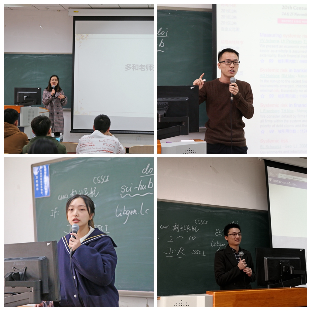 首先,四位国奖得主分别分享了他们在学习、科研等方面的经验。2017精算研冯燕从“加强交流”、“多读书,多学习”、“着手去做”、“常怀感恩之心,诚实做人,踏实做事”四个方面分享了自己的经历,为我们传递了学习经验,并从生活上对学弟学妹予以指引。她表示,寻找兴趣点是学习和研究的关键,我们要积极利用图书馆的资源来挖掘自己的兴趣,填补知识的空缺,要勇于迈开第一步,要用感恩的心来面对老师和同学,踏踏实实做事,诚诚实实做人。2018保险研宁定宸则围绕着“如何找文献”、“如何找教材”、“如何阅读文献”、“读完文献后该做些什么”四方面对如何做科研进行了细致分析。他详细介绍了谷歌学术、JCR等论文搜索工具,并现场进行了演示,让同学们受益匪浅。2019级保险专硕司语琳以“数据和计量”为主题,现场演示了如何有效使用kaiyun官网现有的数据库,并推荐了一些高水平的计量经济学的网课供同学们参考,极具实用性。2017精算研王奕可则从“问题深挖”和“效率”两方面对同学们提出了建议,告诫同学们要注重平衡约束条件和结论严谨性之间的关系。