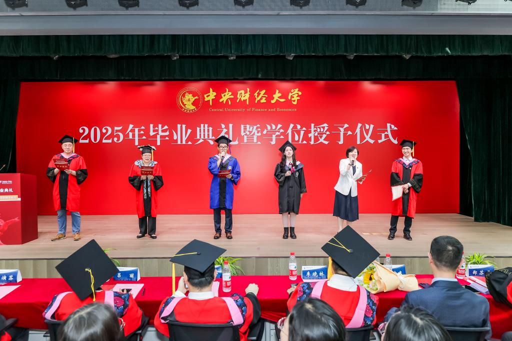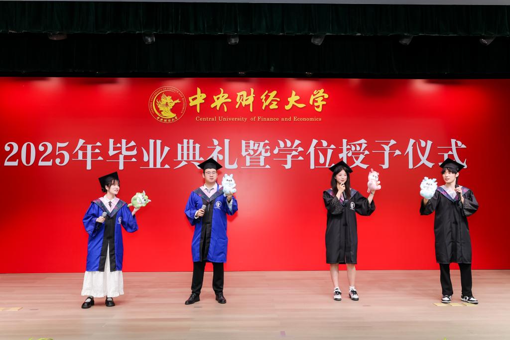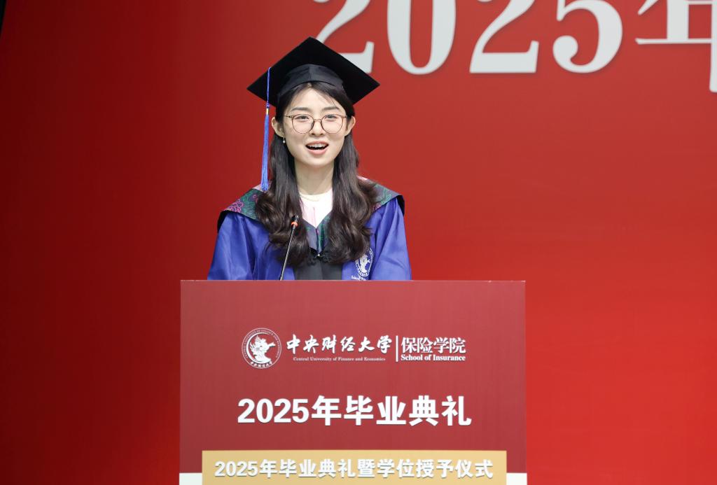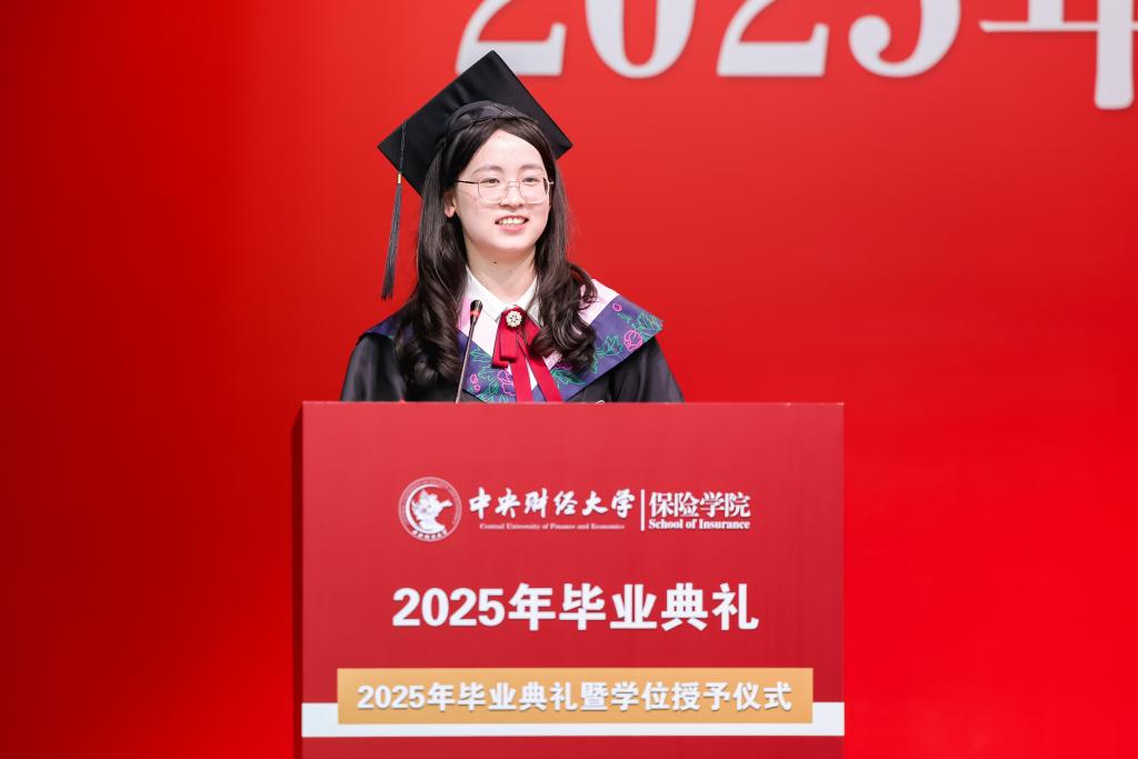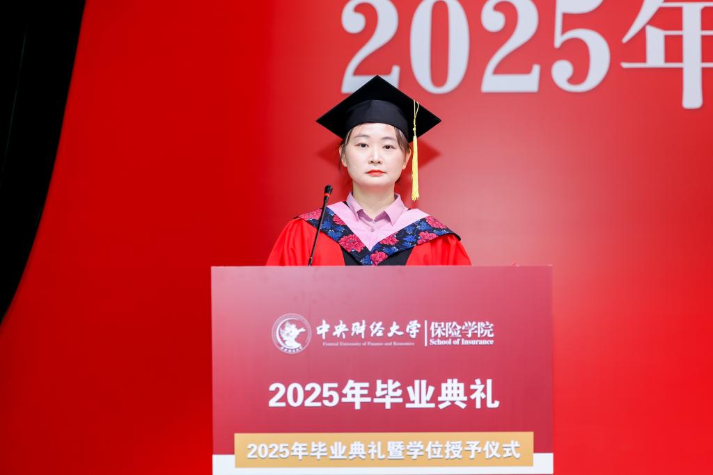 毕业研究生代表刘佳畅和本科毕业生代表李叶先后发言。刘佳畅同学回顾在中财的两年求学时光,感恩母校的培养和老师的教导。她表示,将在未来的岗位上继续发扬中财保险人的精神,脚踏实地,勇攀高峰。李叶同学则分享了自己在校园中的点滴回忆,表达了对同窗情谊的珍视和对未来的憧憬,立志在未来努力拼搏,为保险事业注入青春活力。