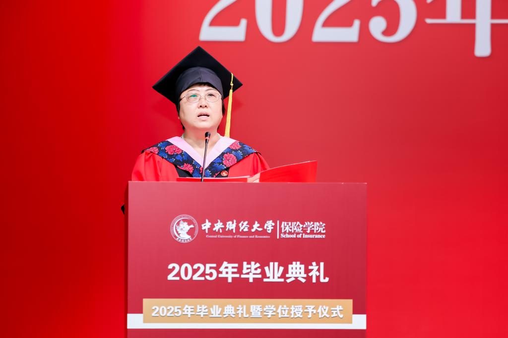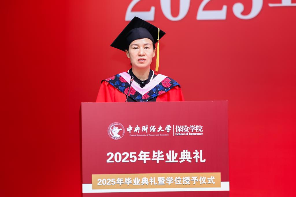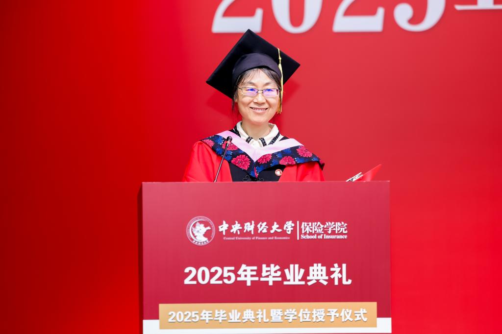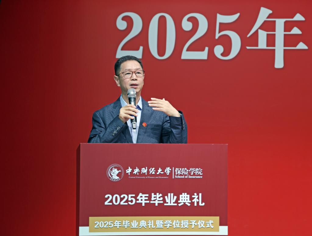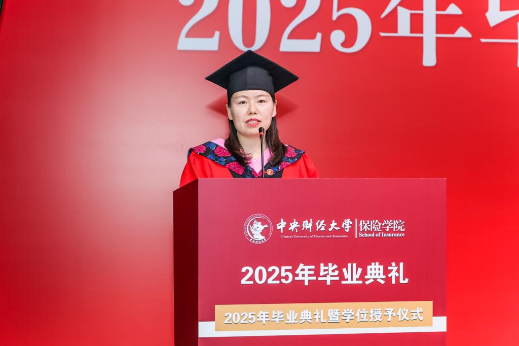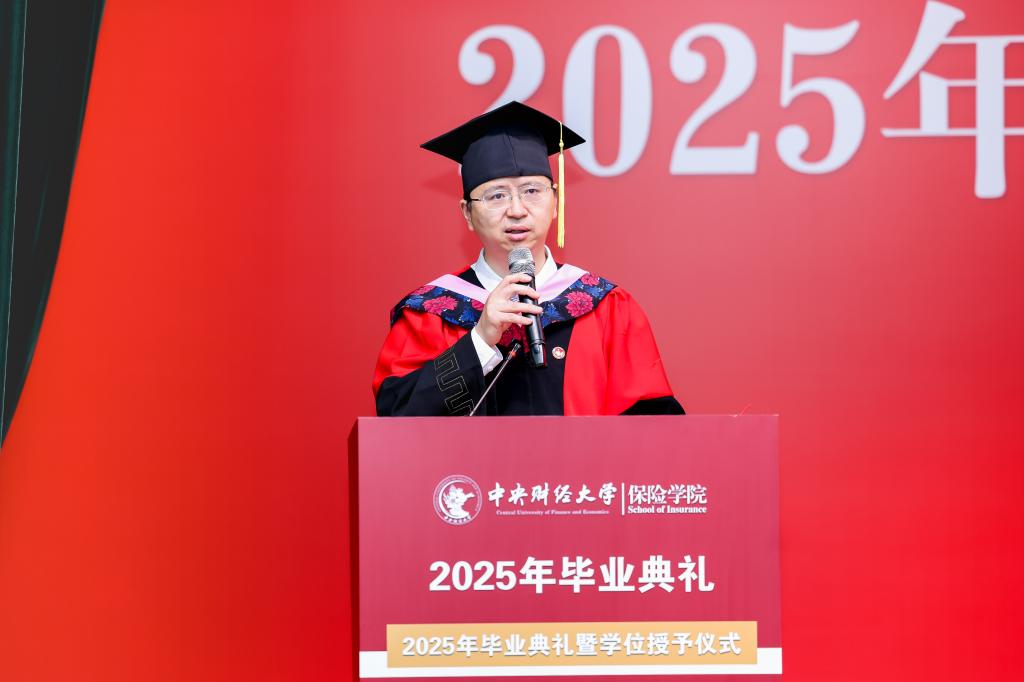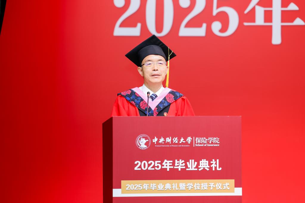 学院教师代表褚福灵教授回顾了同学们在校园里的学习生活。他提到,从保险原理到精算模型,从社保政策到风险管理,同学们在知识的海洋中不断探索,学校见证了每一位同学的成长与蜕变。他希望同学们在未来的职业生涯中坚守职业操守,以严谨的态度对待工作,用专业知识服务社会,成为保险领域的中流砥柱。