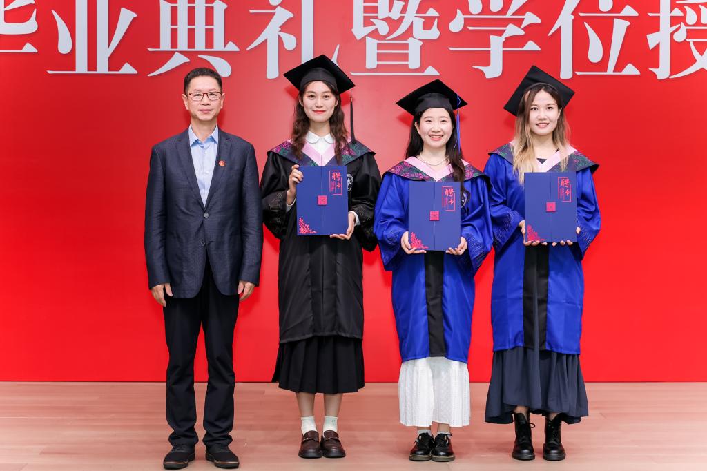 在学位授予仪式环节,王丽珍副院长、郑苏晋副院长分别宣读《关于2025届本科生毕业及授予学士学位的决定》《关于2025届研究生毕业及授予博士、硕士学位的决定》。随后,学位授予仪式正式开始,毕业生们依次上台,周桦院长、吕丽书记、王丽珍副院长、郑苏晋副院长为毕业生拨穗、授予学位。当毕业生们身着学位袍,接过学位证书,接受拨穗的那一刻,现场响起了热烈的掌声,这是对他们学业有成的肯定,更是对他们未来发展的美好祝愿。