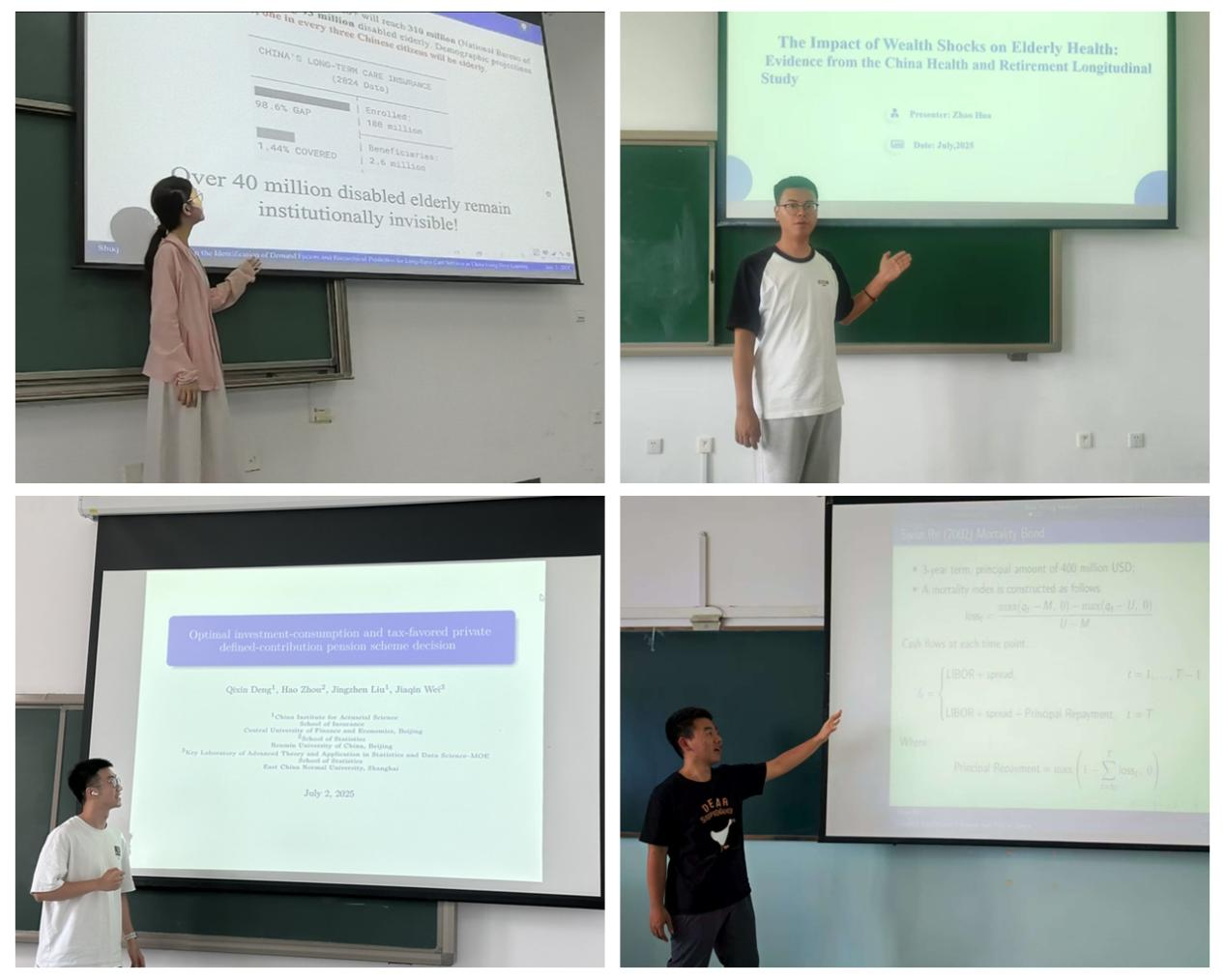 7月4日,续一天同学在“养老金与退休计划II”分会场上汇报了与导师周桦教授合作的研究“Longevity Bond Pricing in Pension with Positive Jumps”。他聚焦于全球老龄化背景下的养老金缺口和长寿风险管理挑战,创新性地结合跳跃扩散过程,构建了一个包含正向跳跃成分和长寿指数的动态框架。该框架的关键在于对Lee-Carter模型进行了重要改进,引入了正向跳跃因子以捕捉短期死亡冲击,并构建了多因子长寿指数来分离长期趋势与短期波动。基于此框架,他运用风险中性估值原理,研究了在非完全市场环境下长寿债券的一致定价方案,进一步提升了长寿风险对冲的理论基础。