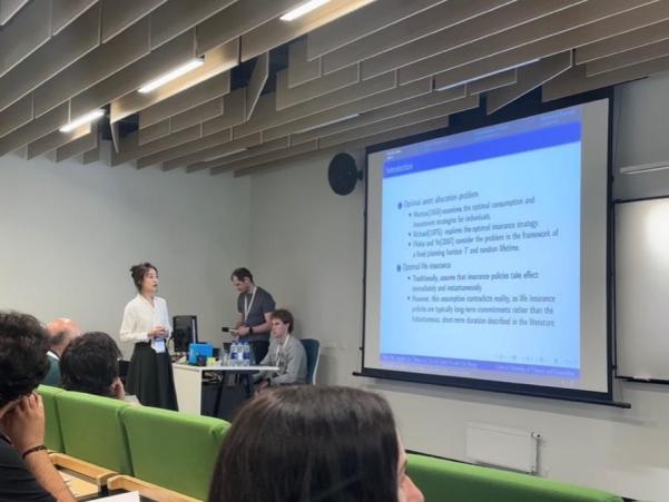 闫诗琪同学在“金融和投资”分会场汇报了其与导师合刘敬真教授合作的研究成果“Optimal asset allocation for a household with multi-claim insurance”。该研究探讨了家庭为工薪成员购买多索赔终身保险时的最优消费、投资与保险策略。有别于传统短期保险,该终身保险不仅涵盖身故赔付,还包括被保险人患病时的家庭给付,且允许在患病前随时增加任意保额。通过拟变分不等式,研究推导了常绝对风险厌恶效用下的解析解并证明了最优保险策略为一个阈值策略。其通过对比展示单次索赔与多次索赔情形的差异,验证了相关结论的稳健性。