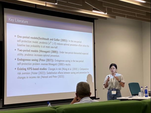 齐梦佳同学在“保险经济学与市场行为”分会场汇报了与导师池义春教授和Richard Peter副教授合作的研究成果“Disentangling risk and time for optimal prevention”。她采用Kreps和Porteus(1978)及Selden(1978)提出的时间偏好模型,研究了谨慎性对两期最优预防行为的影响。她以消费平滑为基准,在分析风险厌恶群体时发现,谨慎性对预防投入具有显著正向作用,这一发现拓展了Menegatti(2009)的研究结论。她在进一步将该结论推广至风险偏好者和不同程度的风险厌恶者时发现,当储蓄行为内生化后,不确定性解决的时间偏好变得无关,边际效用的曲率成为唯一关键因素。因此,该模型可以识别出一类谨慎者和一类不谨慎者,其预防的努力程度与风险中性者一致。研究表明,跨期偏好的结构对谨慎性与预防之间关系具有决定性影响。